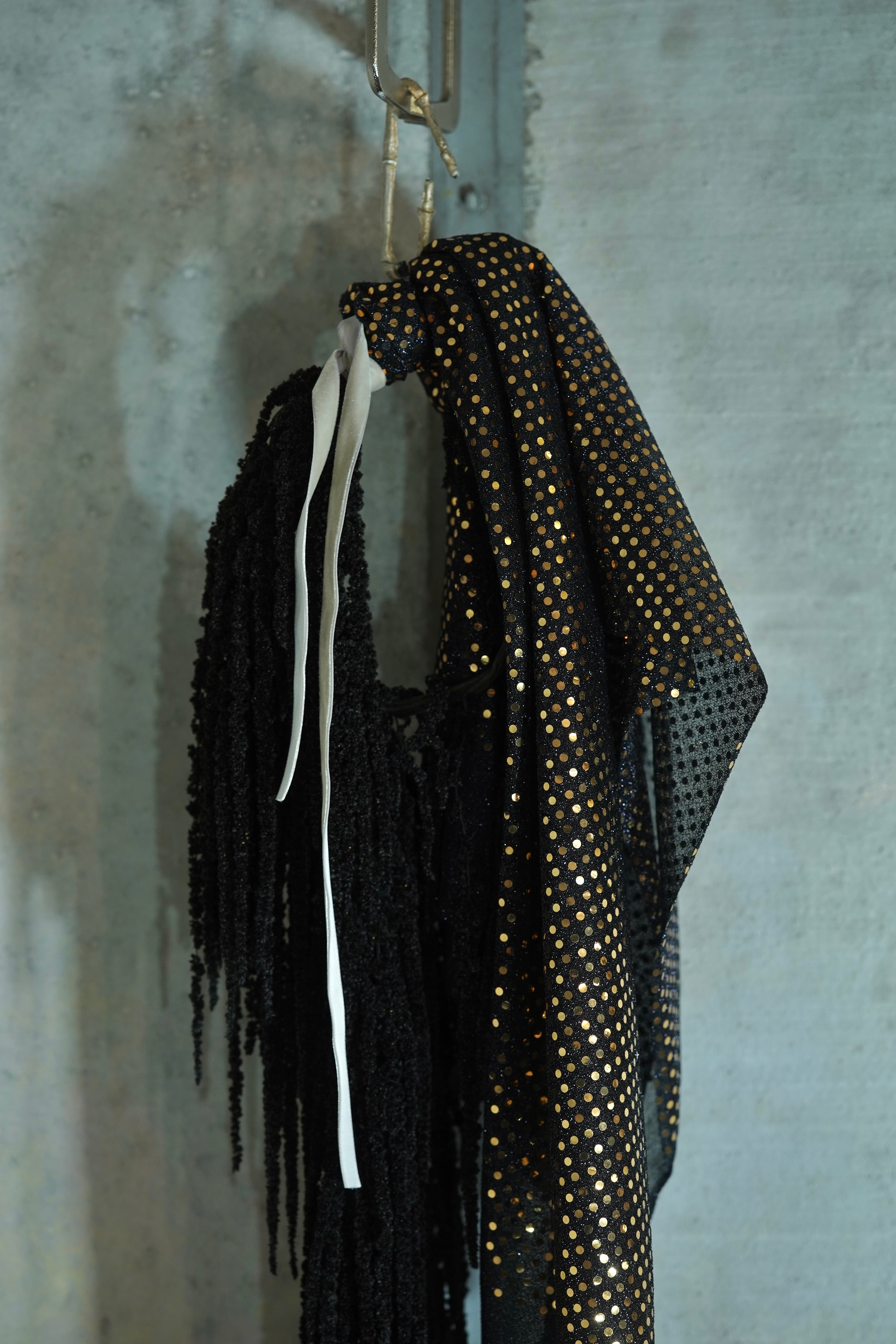 素材:ブラックアマランサス、ドットゴールドのメッシュ、ベロアのリボン